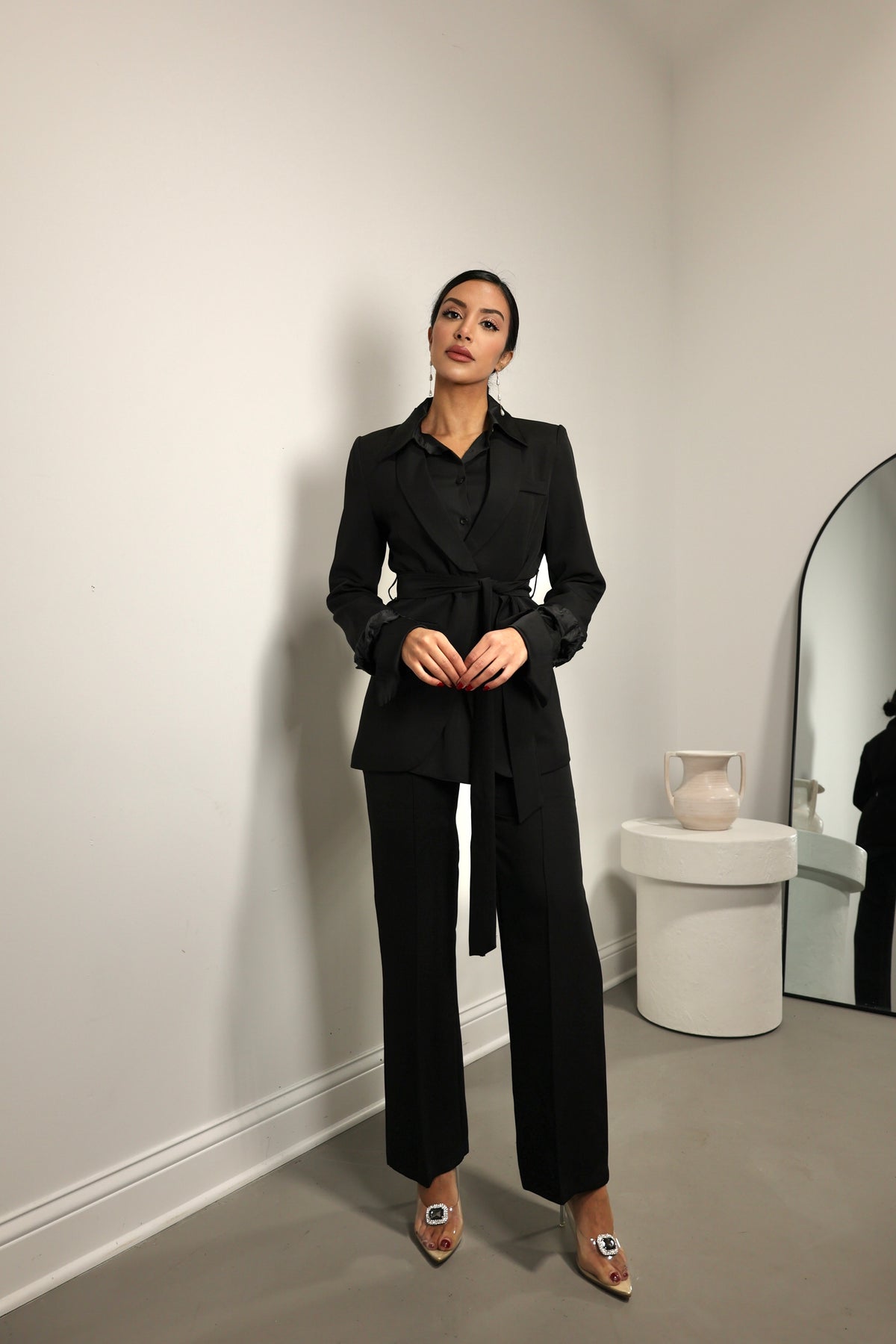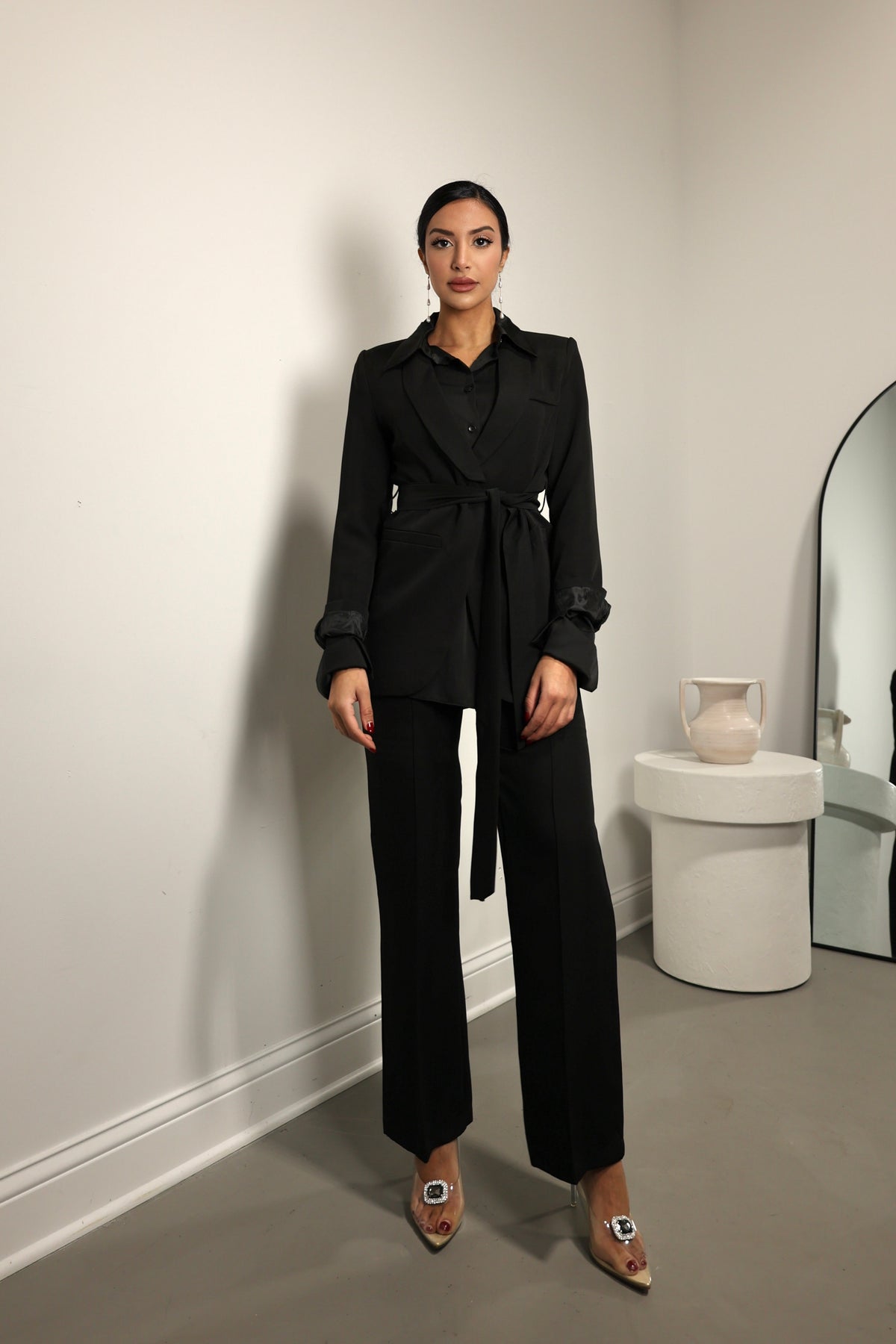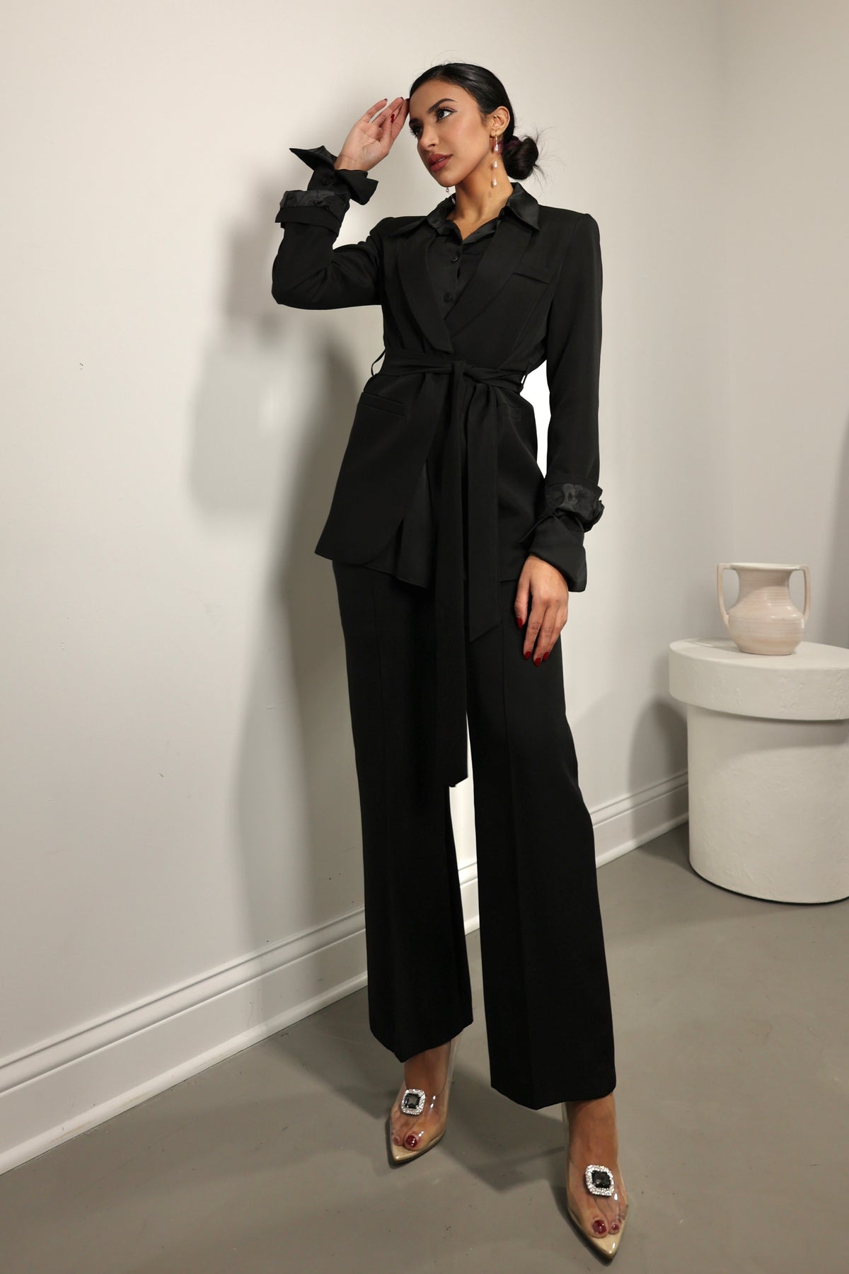 Elevate your wardrobe with this chic two-piece set, featuring a crisp white blazer that is beautifully tailored to cinch at the waist, enhanced by a self-fabric belt for added definition. The matching straight-leg trousers maintain a sleek and clean line, offering both comfort and style. This set is a versatile choice for a variety of occasions, from office wear to elegant evenings out.