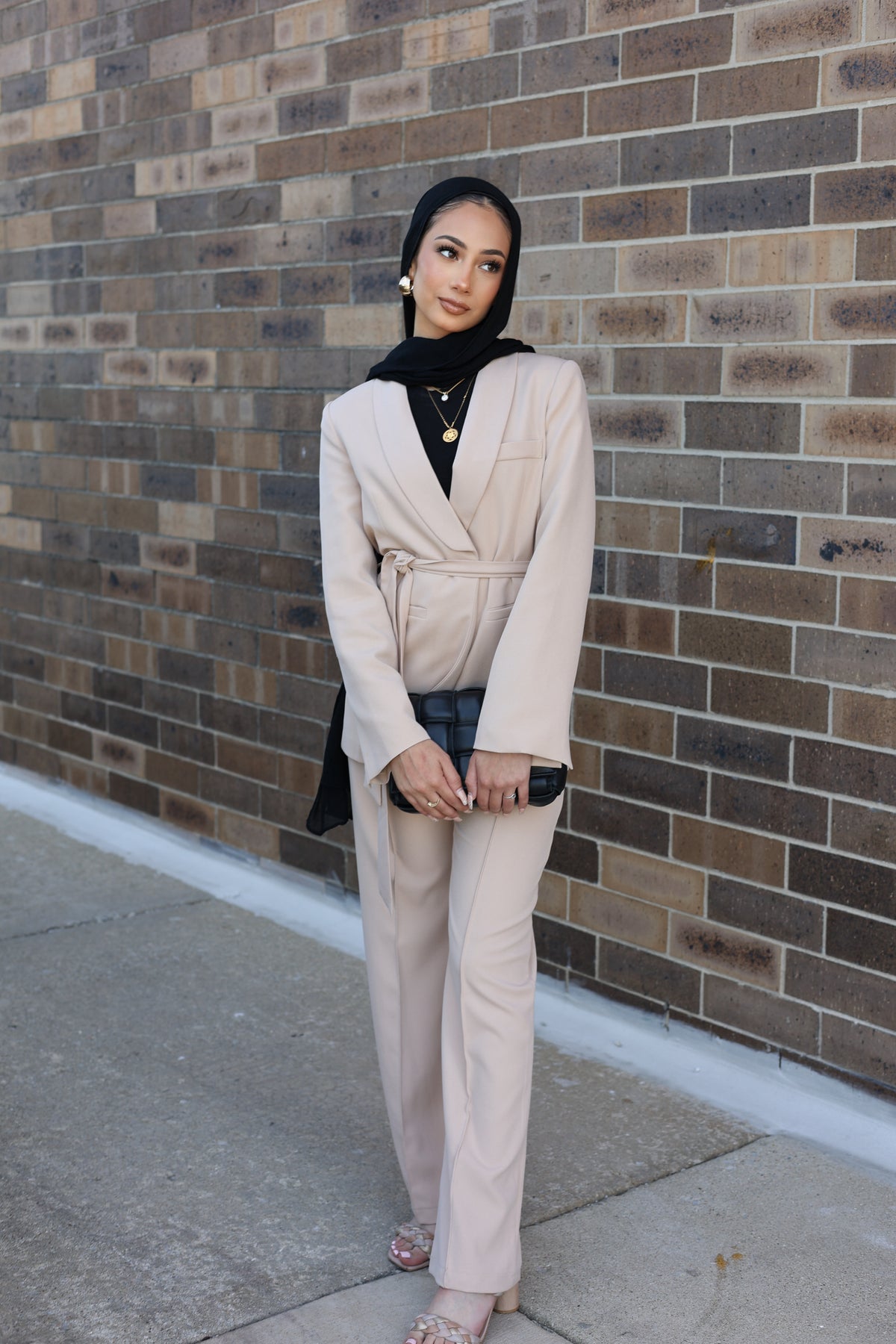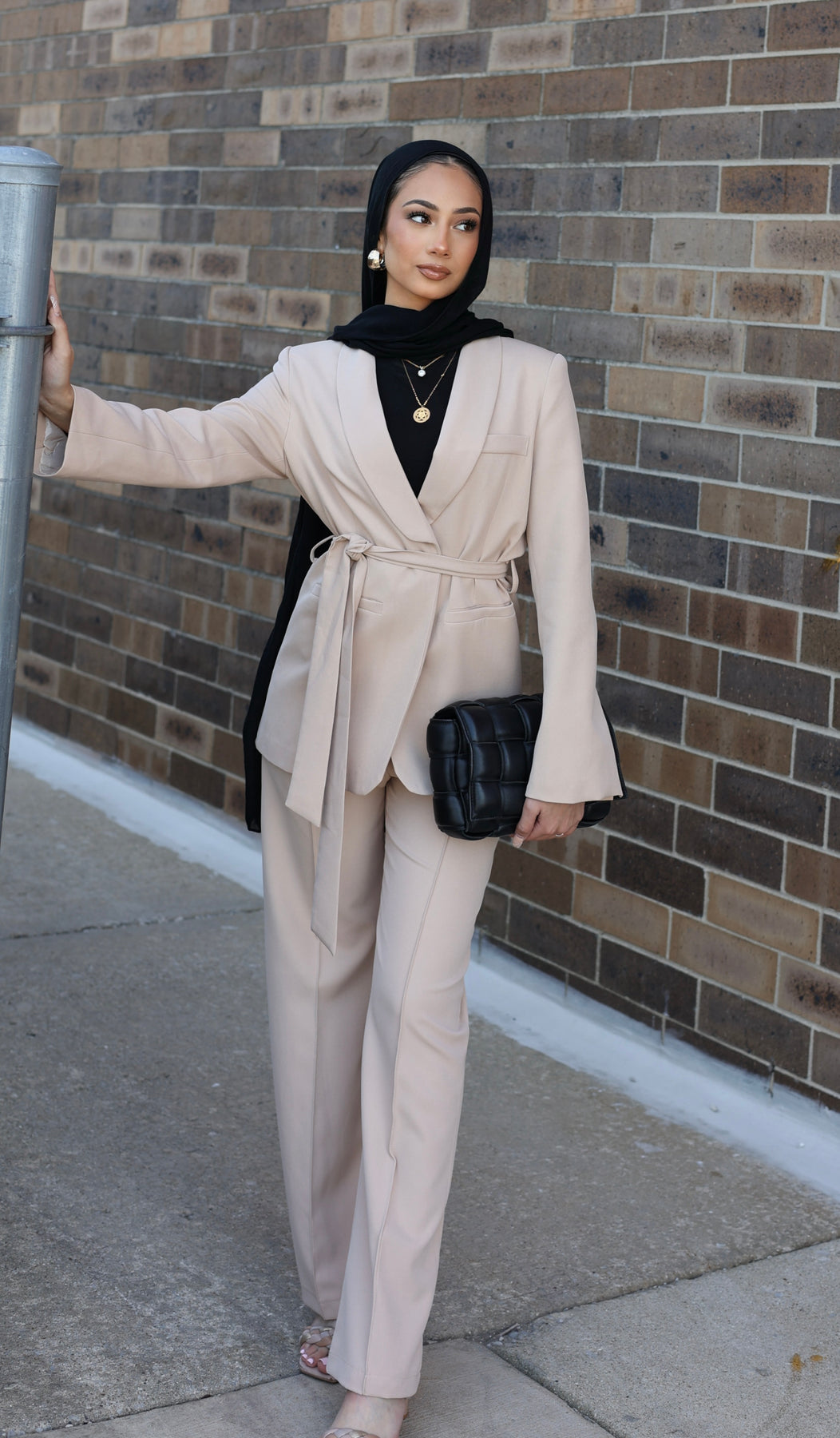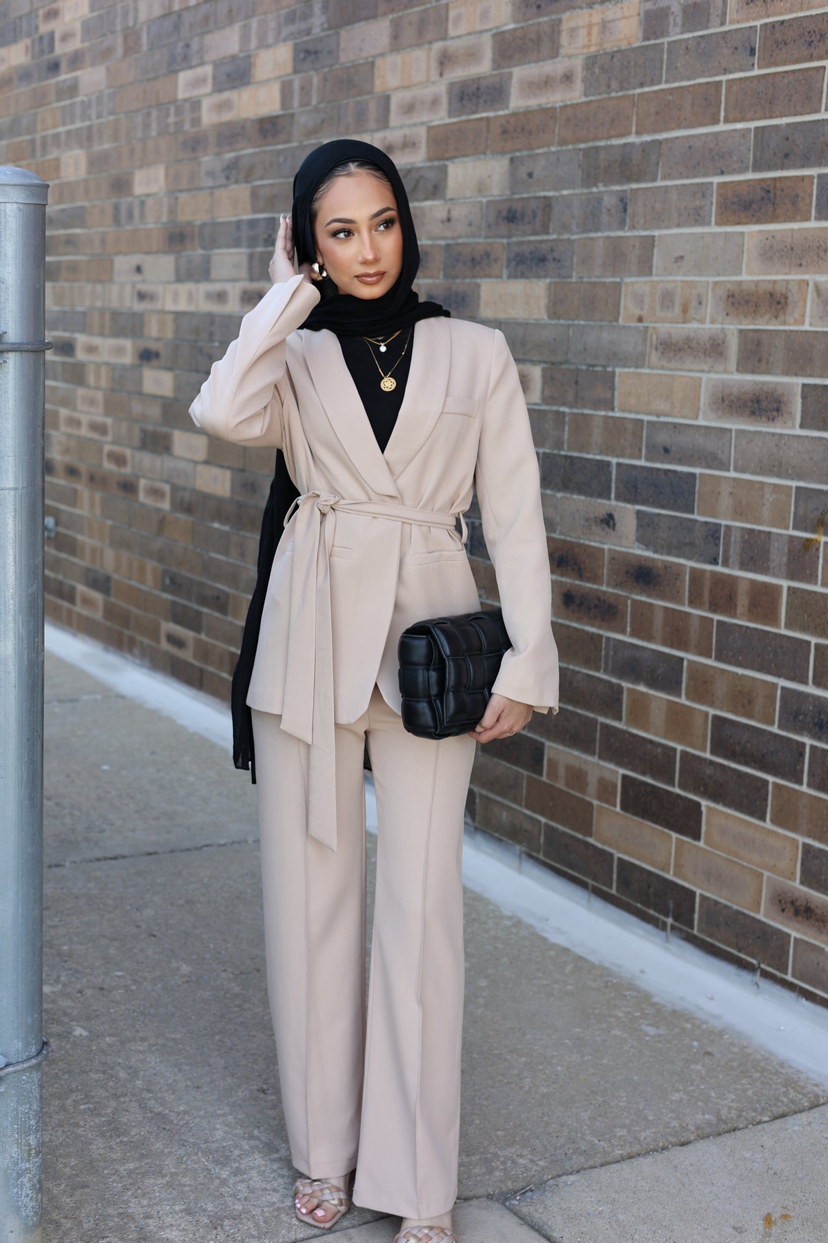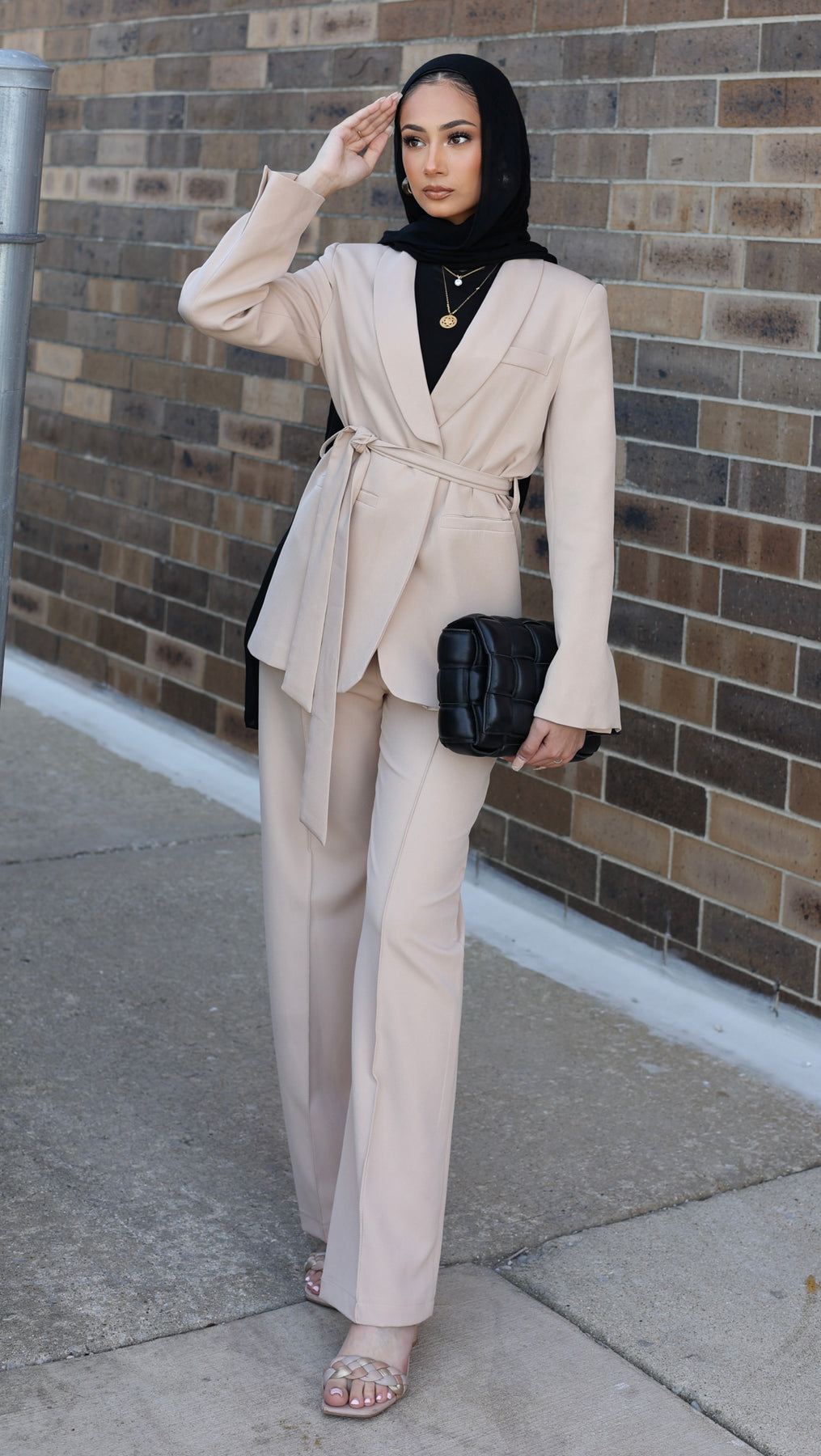 Elevate your wardrobe with this chic two-piece set, featuring a blazer that is beautifully tailored to cinch at the waist, enhanced by a self-fabric belt for added definition. The matching straight-leg trousers maintain a sleek and clean line, offering both comfort and style. This set is a versatile choice for a variety of occasions, from office wear to elegant evenings out.