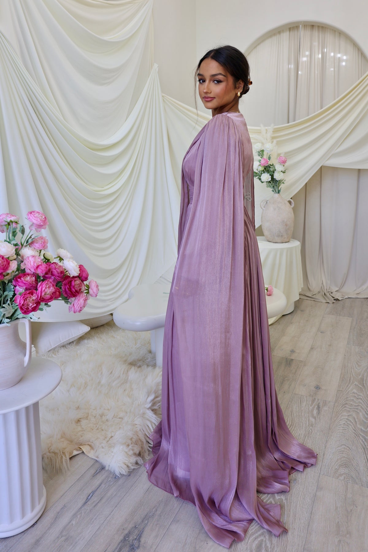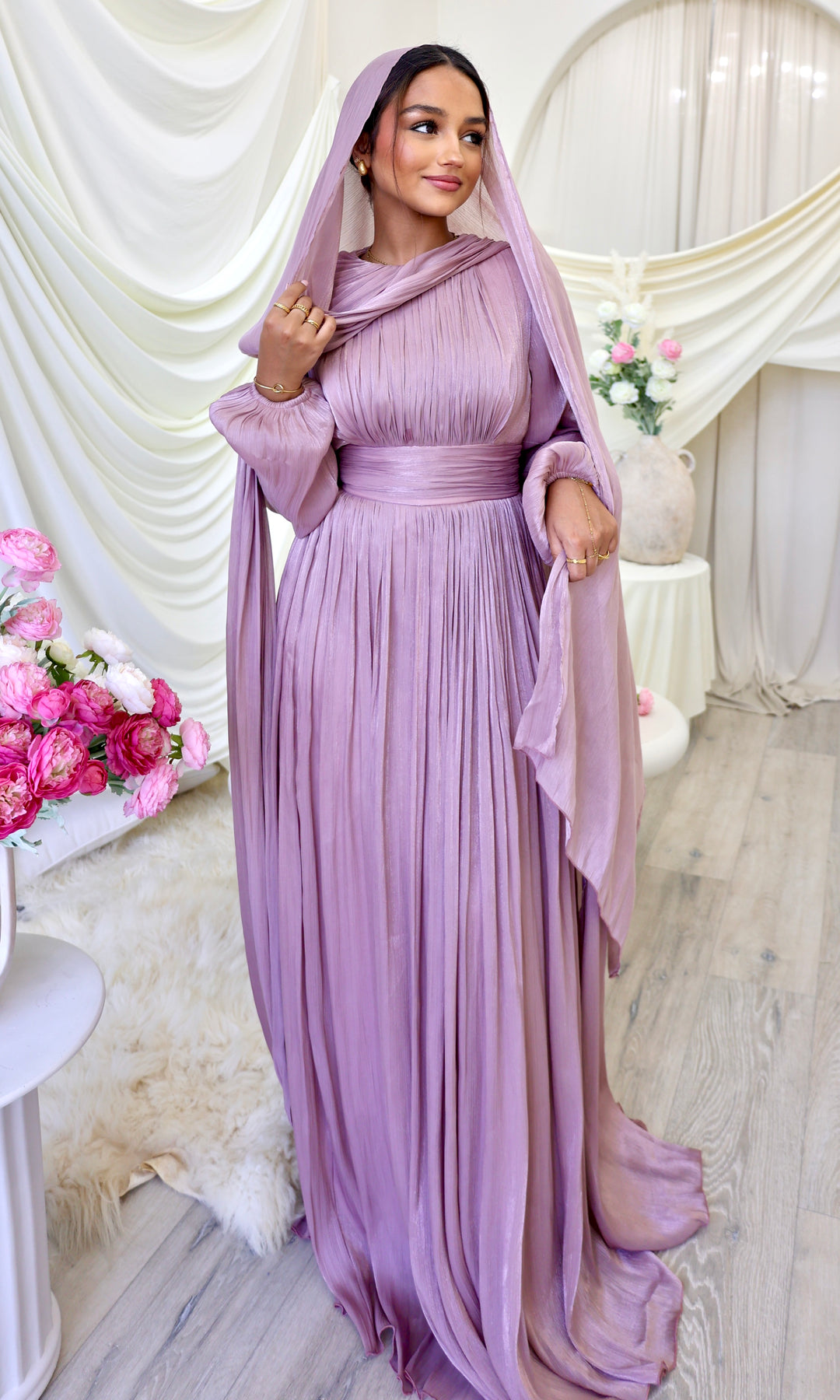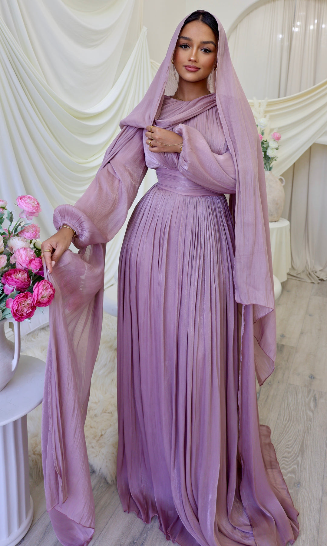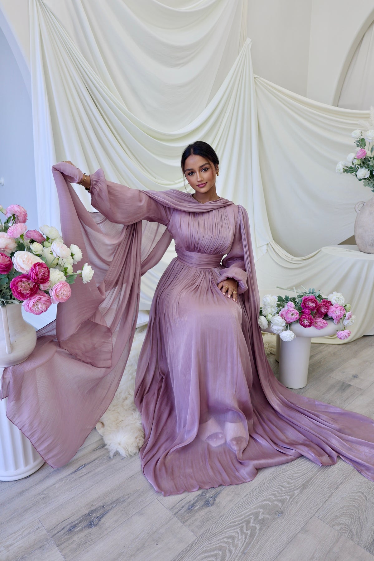Tuleen Gown is crafted from a lightweight, flowy fabric with a soft shimmer finish that glides with every step. Designed with delicate pleats across the bodice and skirt, its structured waistband defines the silhouette while the dramatic cape-style sleeves and matching head scarf add a regal touch. Perfect for formal occasions, weddings, or Eid, this gown is a timeless statement of femininity and sophistication.