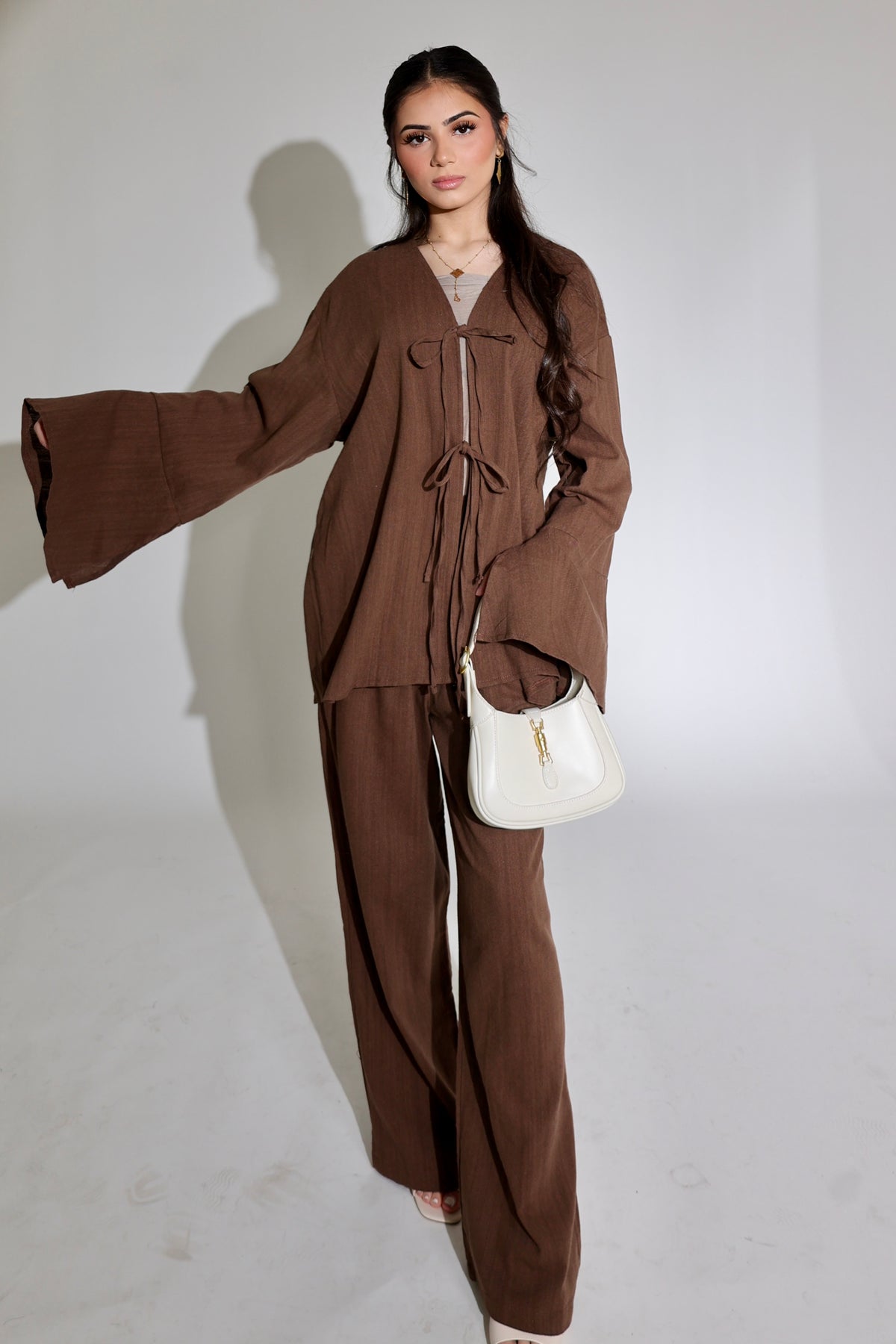 Meet the Amal Co-ord Set, your new go-to for effortless style and all-day comfort. This beautifully designed two-piece features a flowy tie-front top with statement flared sleeves and a matching pair of wide-leg pants that offer the perfect balance of structure and ease.